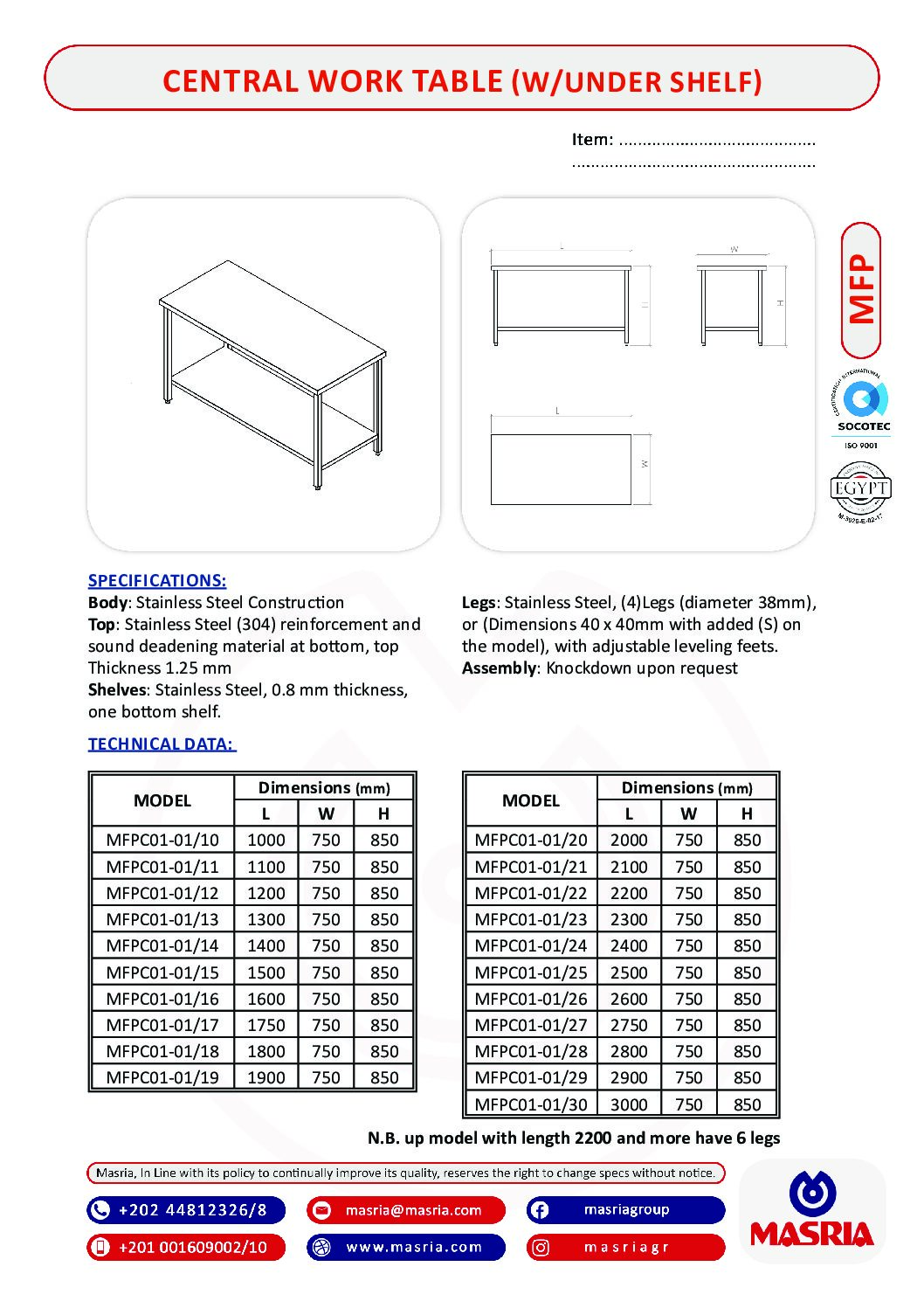 N.B. up model with length 2200 and more have 6 legs