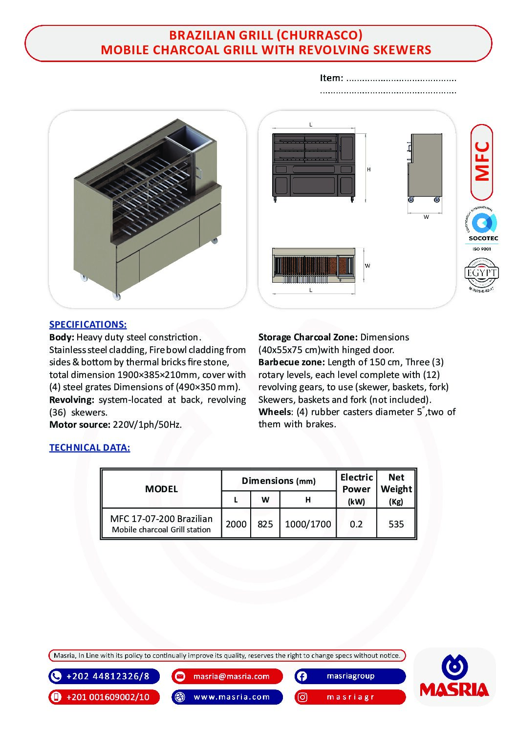 MODEL (MFC 17-07-200 Brazilian) – Dimensions (2000×825×1000/1700) – Electric Power 0.2 (K.W ) – .Net Weight 535 (Kg) .