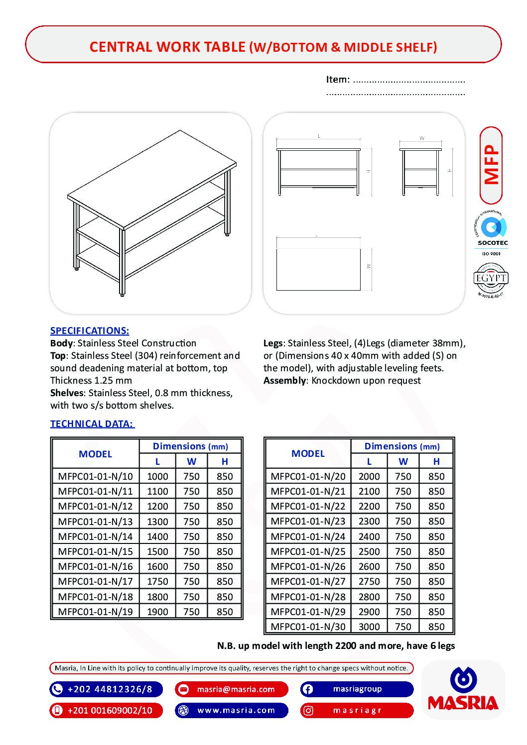 Legs: Stainless Steel, (4)Legs (diameter 38mm), or (Dimensions 40 x 40mm with added (S) on the model), with adjustable Leveling feets.