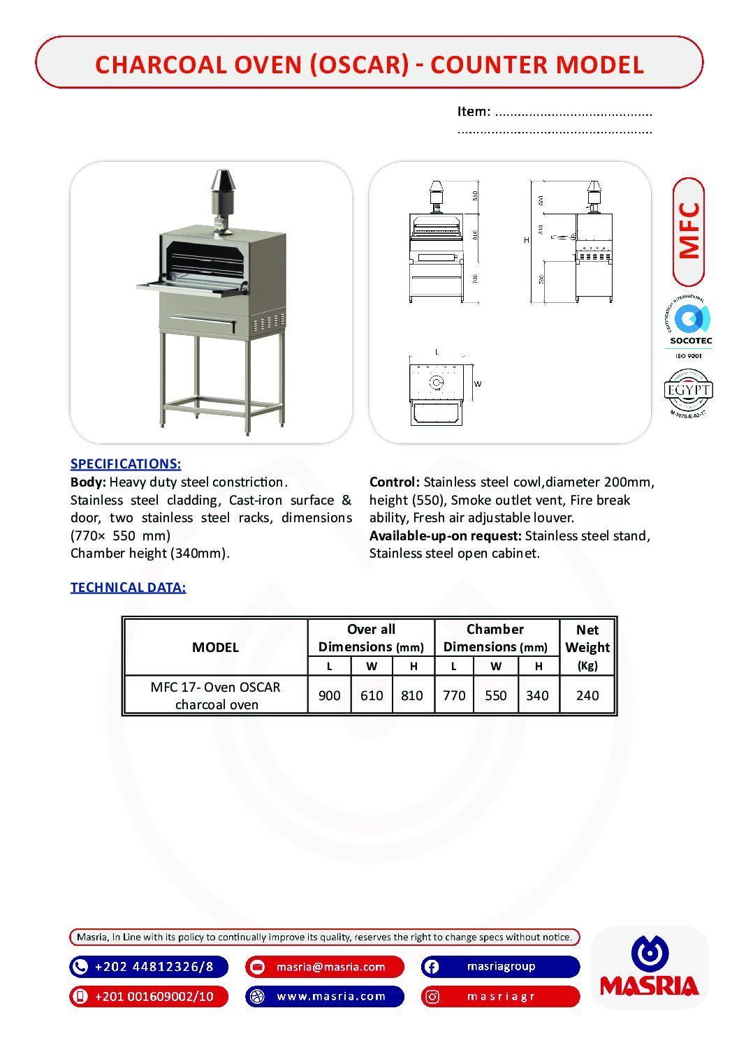 MODEL (MFC 17- Oven OSCAR) – Over all Dimensions (900×610×810) -Chamber Dimensions (770×550×340) Net Weight 240 (Kg).