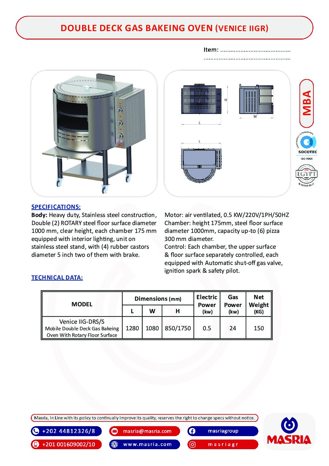 MODEL                                                     Dimensions (mm)               Electric Power(kw)        Gas Power (kw)     Net Weight