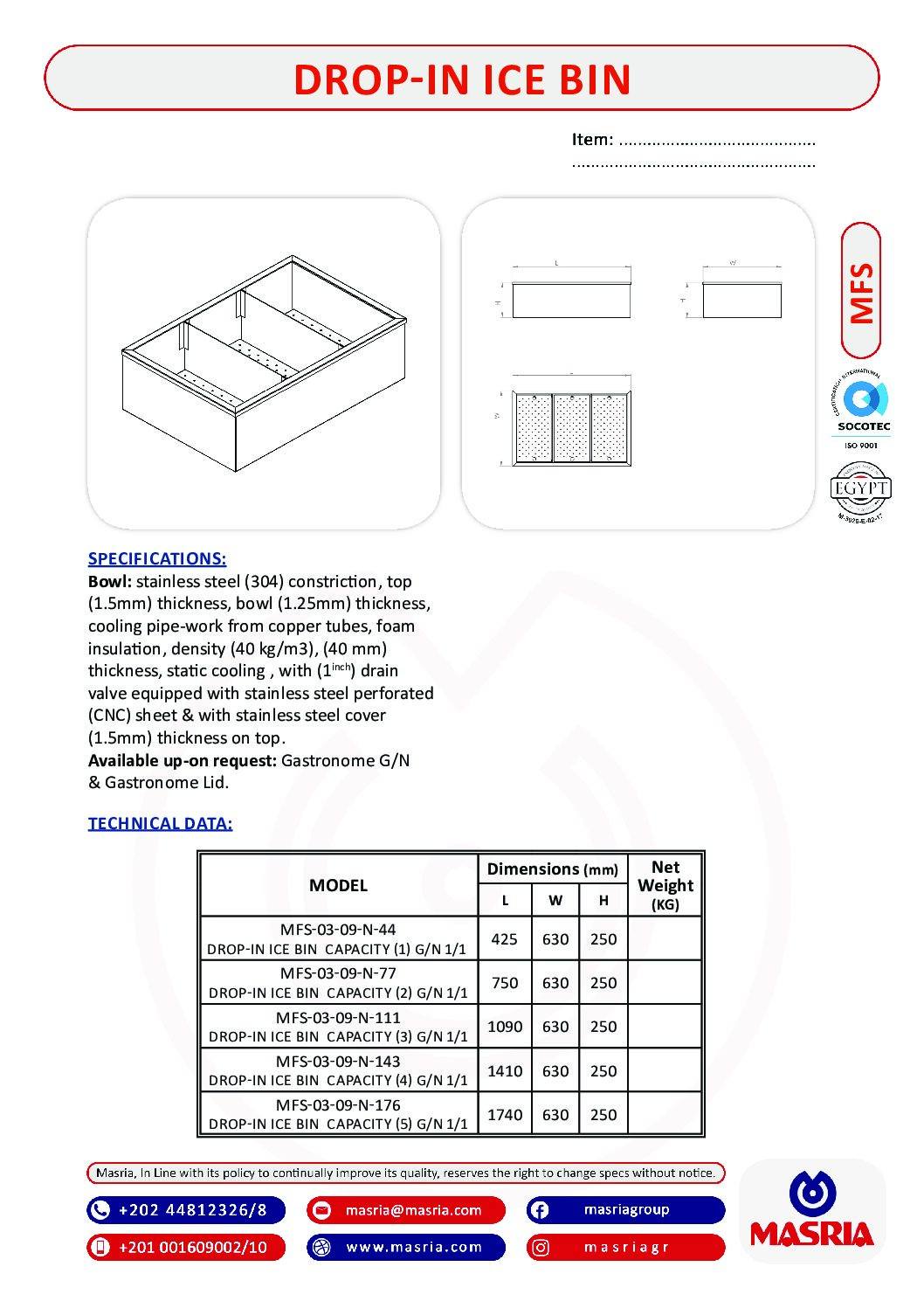 DROP-IN ICE BIN CAPACITY (3) G/N 1/1                                        1090X 630X 250