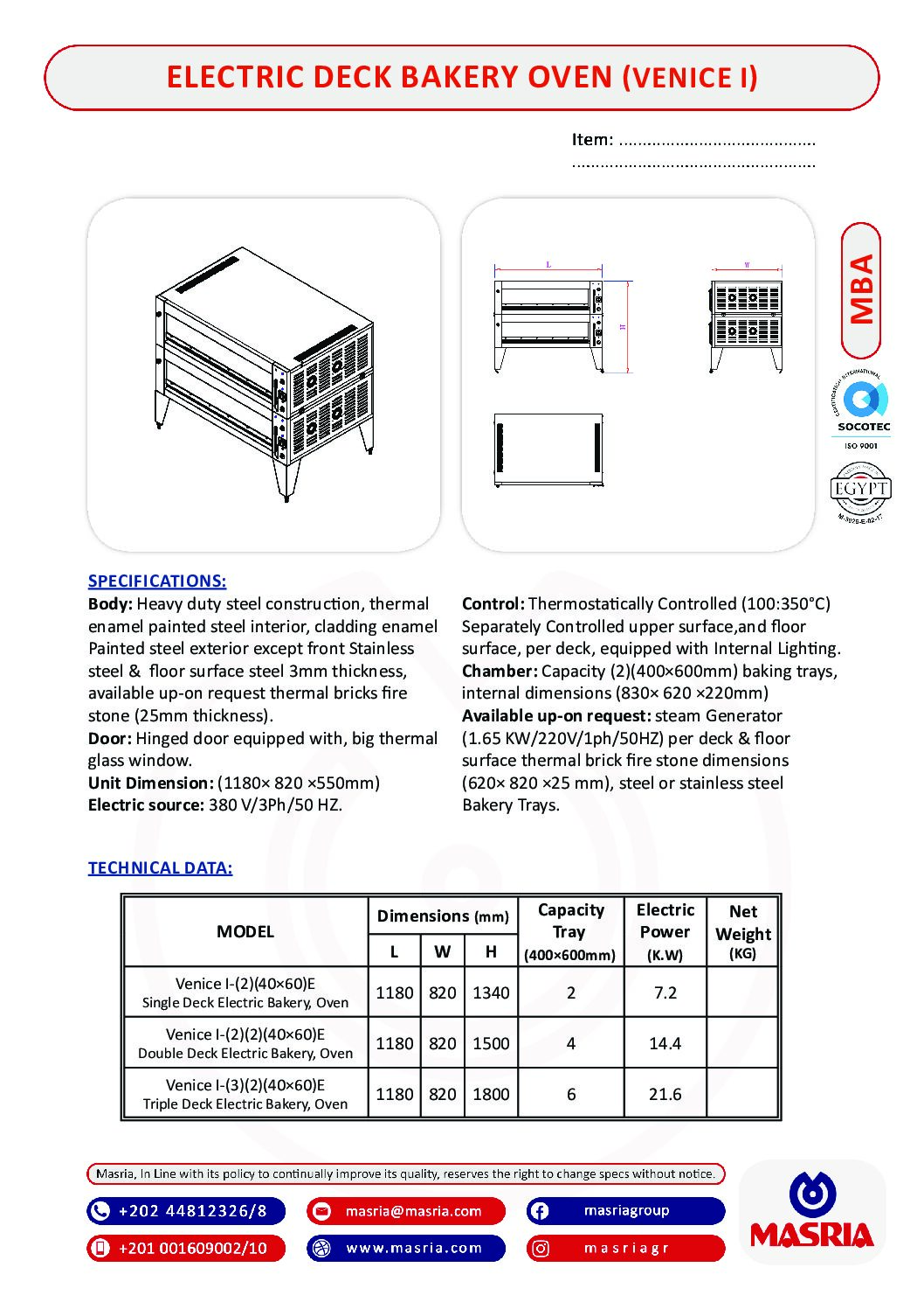 MODEL Dimensions (mm) CapacityTray(400 × 600 mm) Electric Power(K.W)