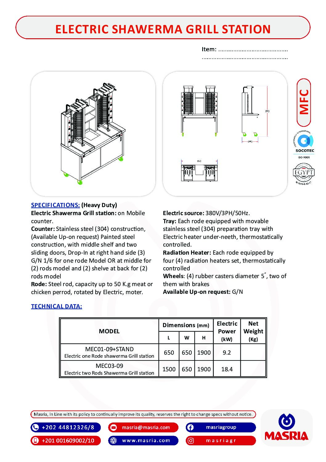 MODEL (MEC03-09) – Dimensions (1500×650×1900) – Electric Power 18.4 (kw).