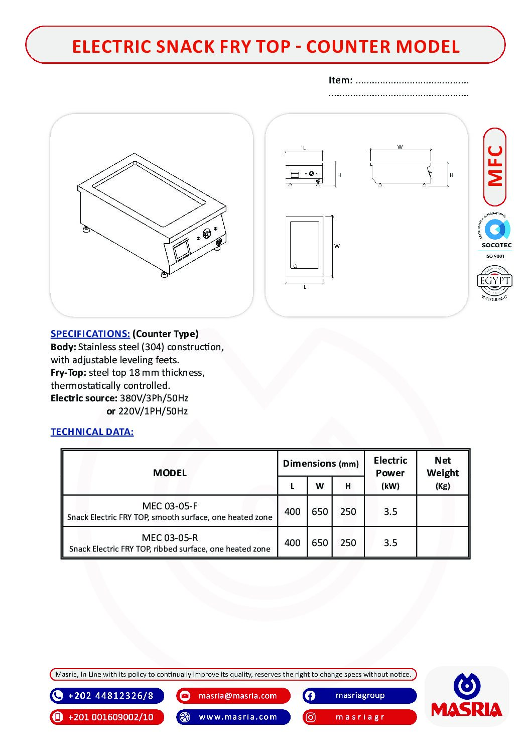 MODEL (MEC 03-05-F) – Dimensions (400×650×250) – Electric Power 3.5 (kw) .