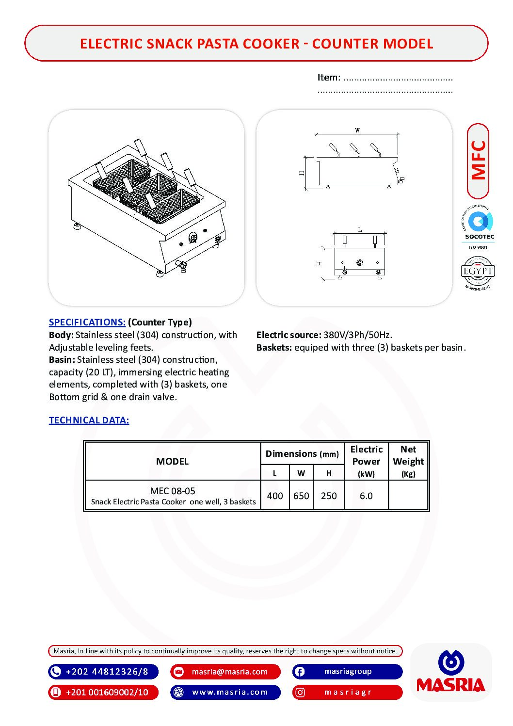 MODEL (MEC 08-05) -Dimensions (400×650×250) – Electric Power 6.0 (kw).