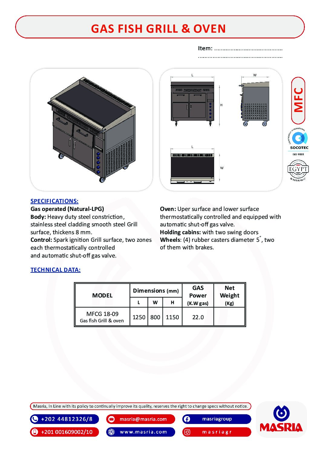 MODEL (MFCG 18-09) – Dimensions (1250×800×1150) – GAS Power 22.0 (K.W gas) .