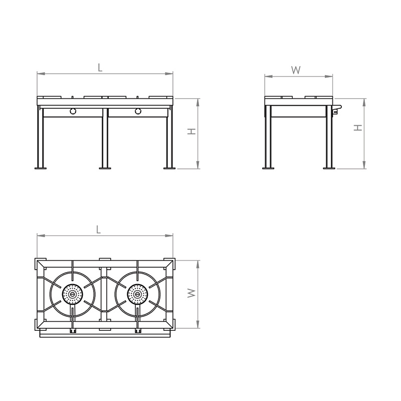 Burner: (3) rings, Heavy duty, each equipped, with shut-off gas valve.