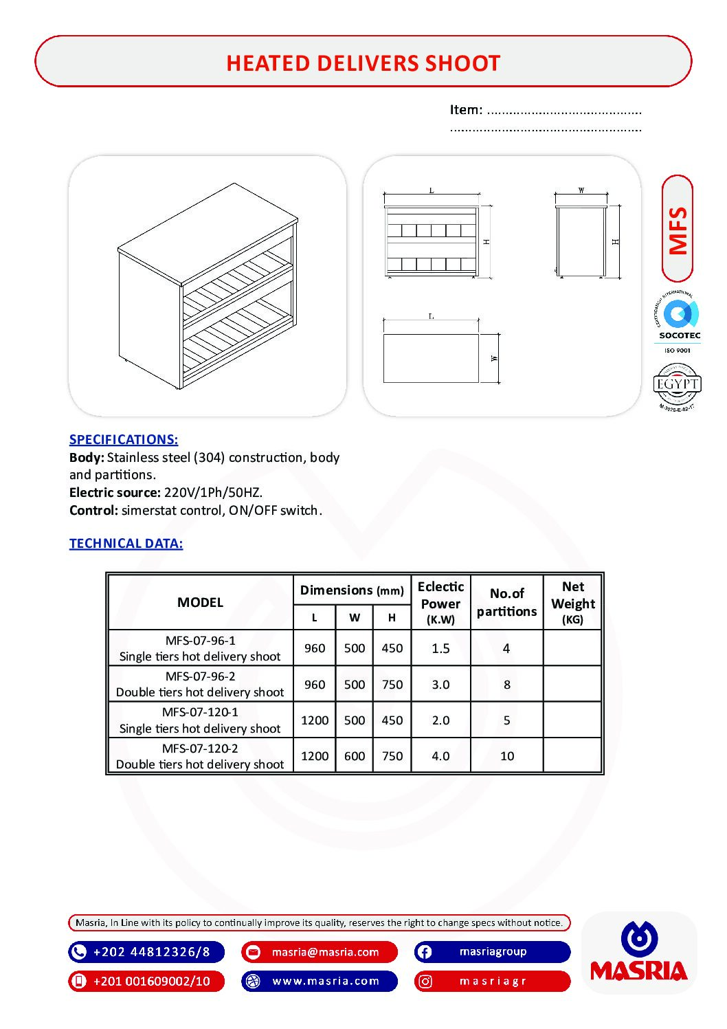 MODEL Dimensions (mm) Eclectic Power (K.W) No.of partitions