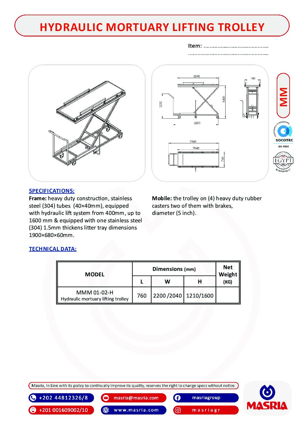 Frame: heavy duty construction, stainless steel (304) tubes ‎‎(40‎‏×‏‎40mm), equipped with hydraulic lift system from ‎‎400mm, up to 1600 mm & equipped with one stainless steel ‎‎(304) 1.5mm thickens litter tray dimensions ‎‎1900‎‏×‏‎680‎‏×‏‎60mm.‎