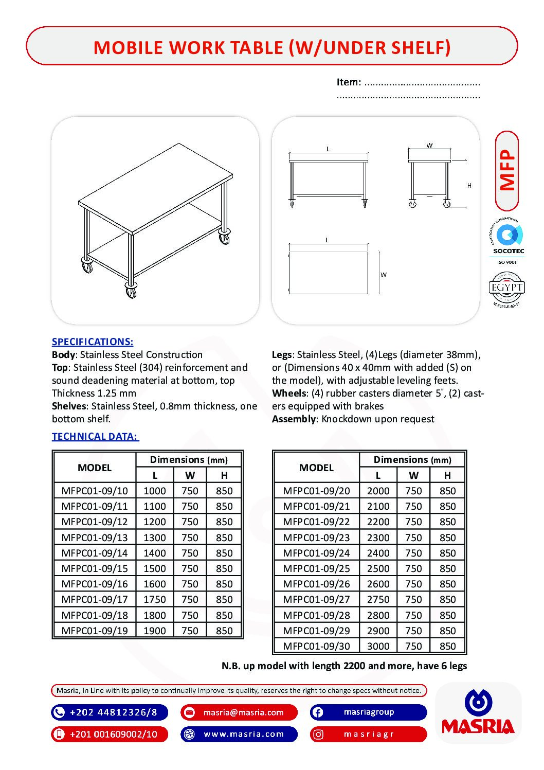 Legs: Stainless Steel, (4)Legs (diameter 38mm), or (Dimensions 40 x 40mm with added (S) on the model), with adjustable Leveling feets.