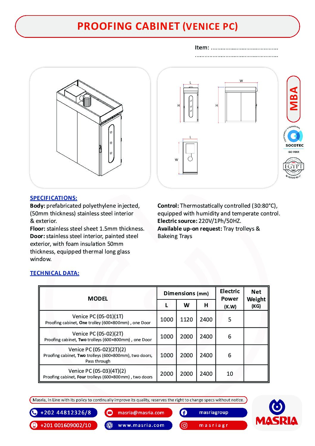 Proofing cabinet,One trolley (600 × 800mm) , one Door                    1000x 1120x 2400                                   5