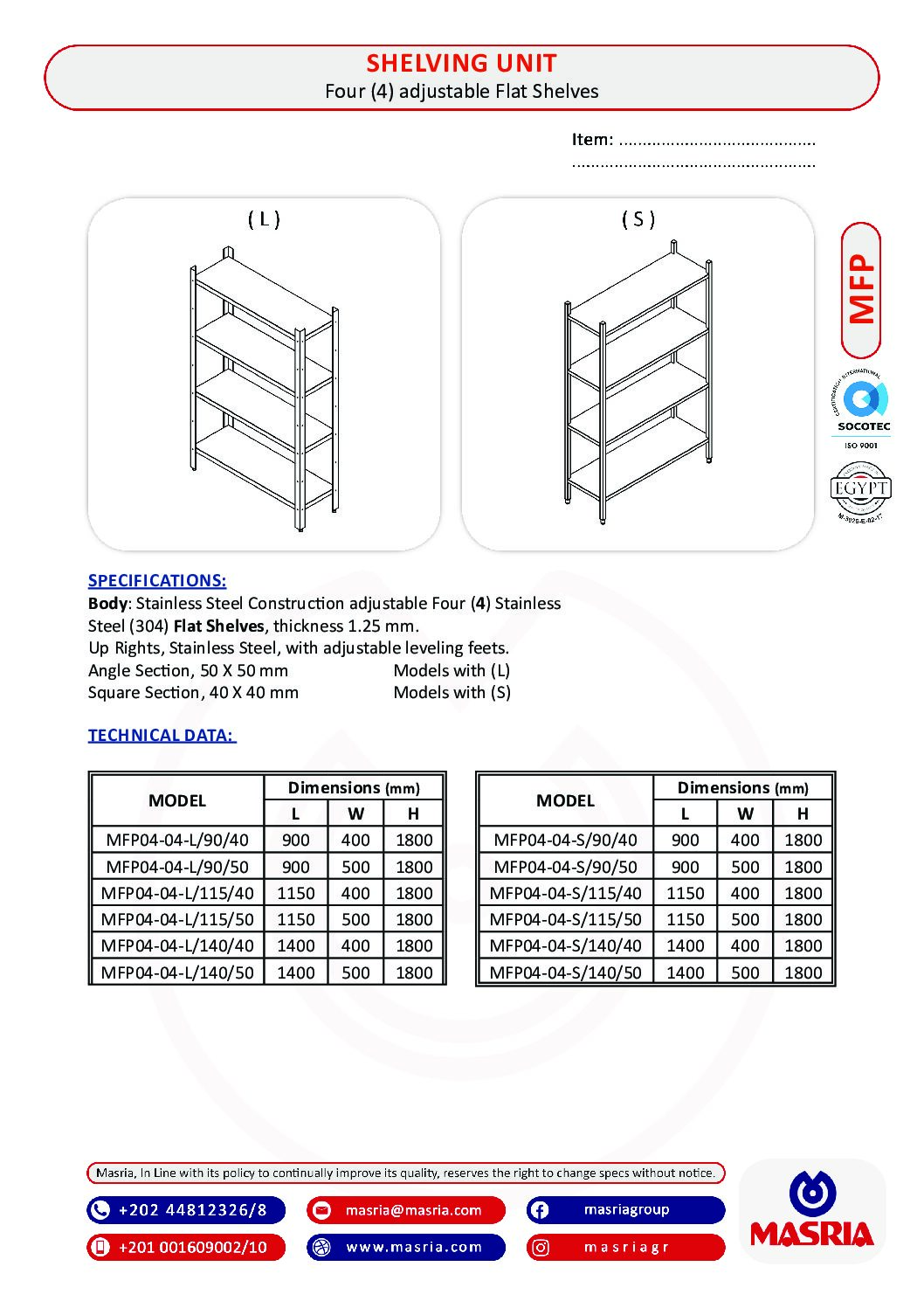 Square Section, 40 X 40 mm Models with (S)