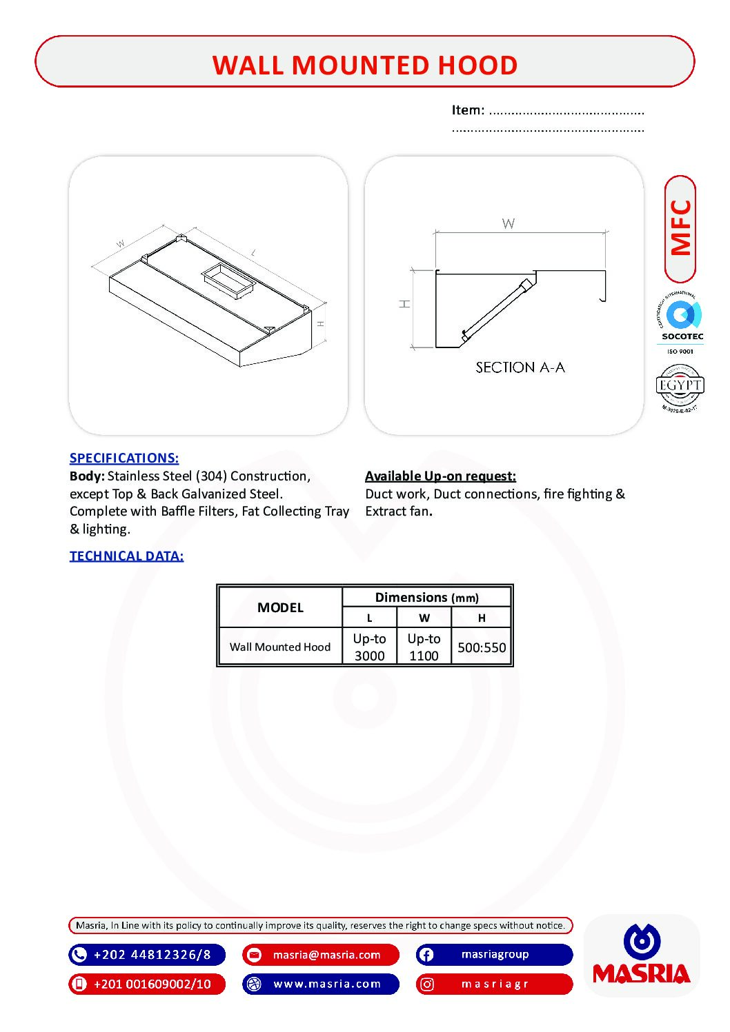 MODEL (Wall Mounted Hood) – Dimensions (UP-TO 3000×UP-TO 1100×500:550) .